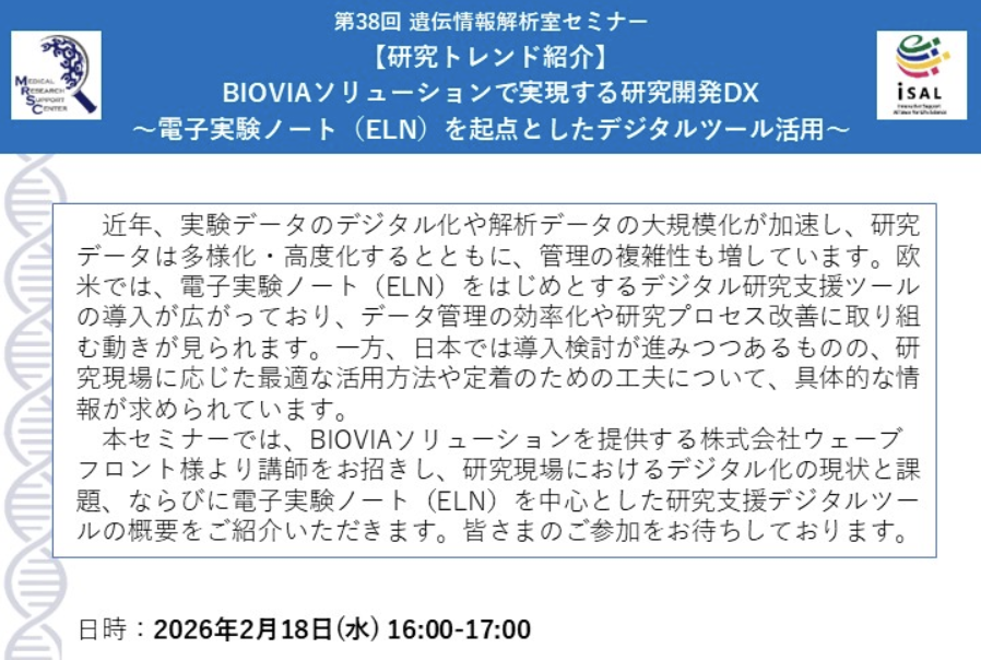 【遺伝情報解析室】第38回遺伝情報解析室セミナー「【研究トレンド紹介】 BIOVIAソリューションで実現する研究開発DX ~電子実験ノート(ELN)を起点としたデジタルツール活用~」を開催します
