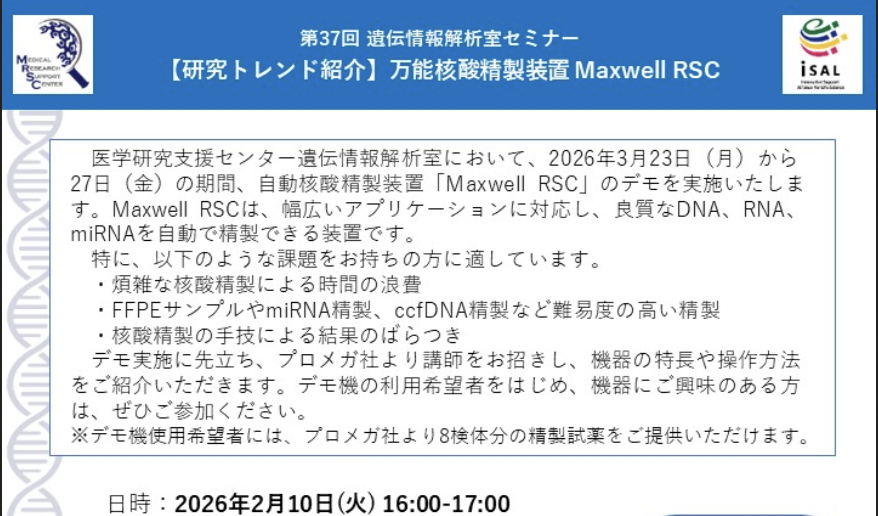 【遺伝情報解析室】第37回遺伝情報解析室セミナー「【研究トレンド紹介】万能核酸精製装置 Maxwell RSC」を開催します