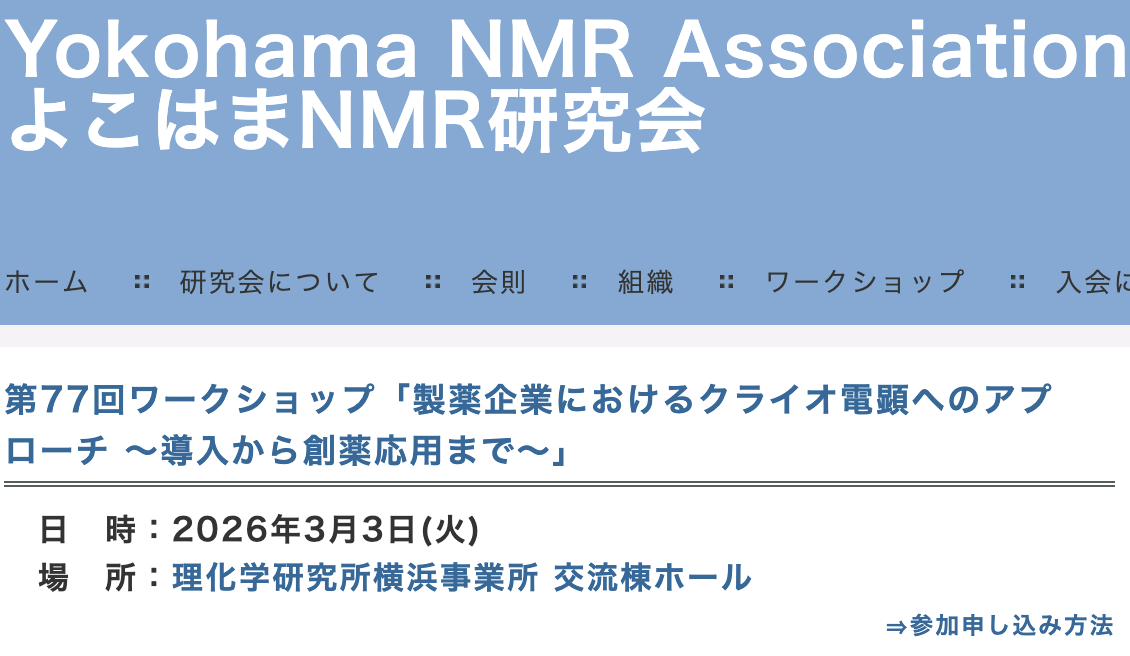 よこはまNMR研究会 第77回ワークショップ「製薬企業におけるクライオ電顕へのアプローチ ~導入から創薬応用まで~」