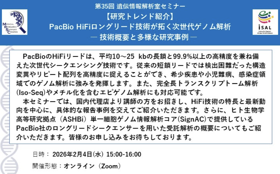 【遺伝情報解析室】第35回遺伝情報解析室セミナー「【研究トレンド紹介】PacBio HiFiロングリード技術が拓く次世代ゲノム解析― 技術概要と多様な研究事例 ―」を開催します