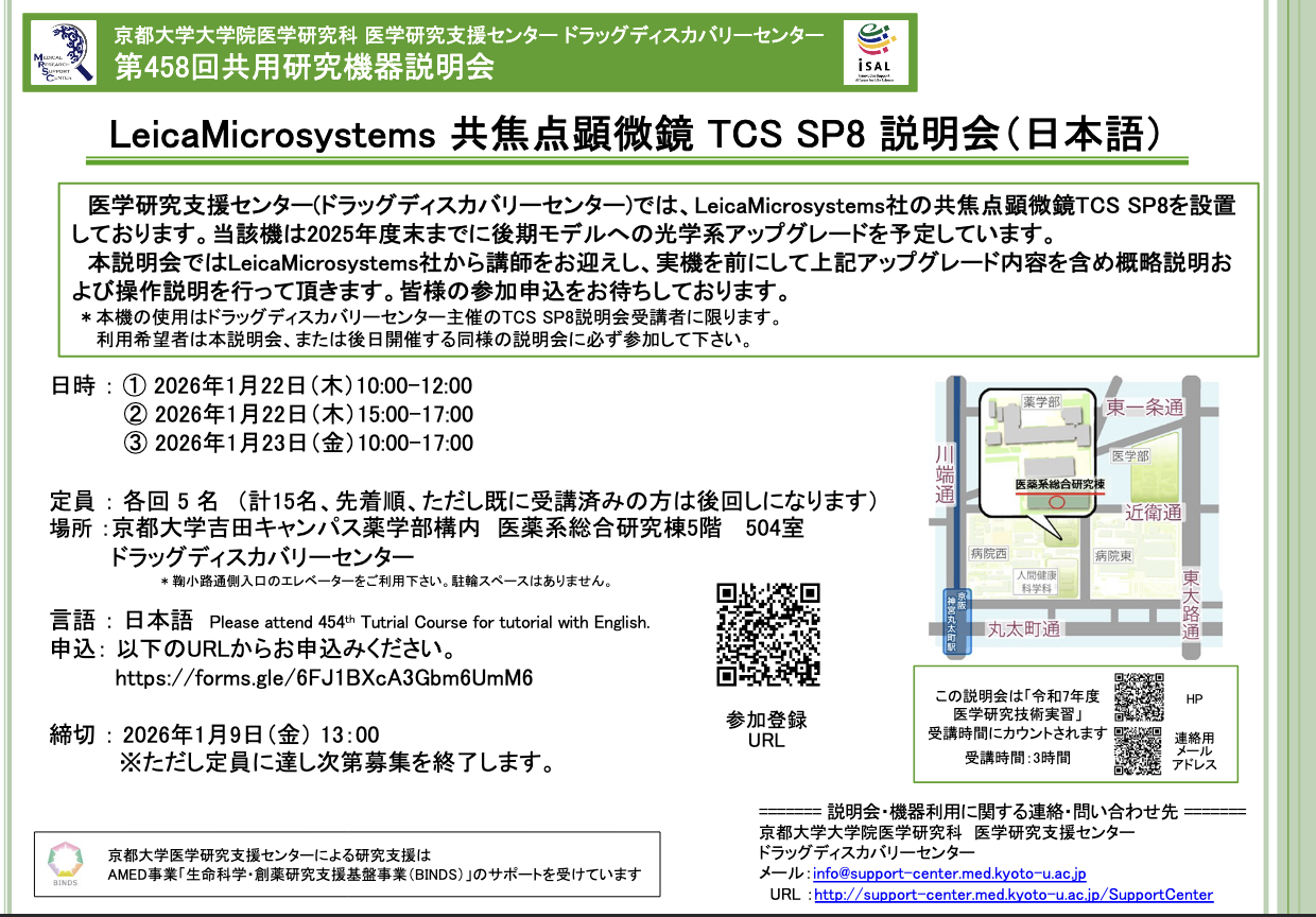 【ドラッグディスカバリーセンター】第458回共用研究機器説明会を開催します(LeicaMicrosystems 共焦点顕微鏡 TCS SP8 説明会)※1月22日または23日