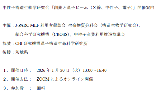 中性子構造生物学研究会「創薬と量子ビーム(X線、中性子、電子)」開催のお知らせ