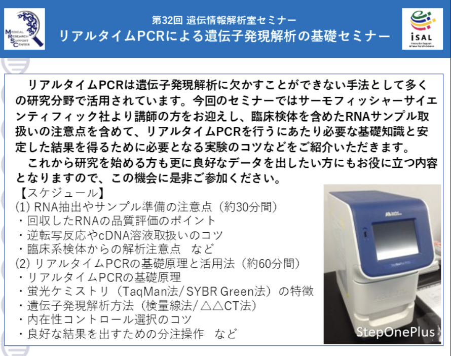 【遺伝情報解析室】第32回遺伝情報解析室セミナー「リアルタイムPCRによる遺伝子発現解析の基礎セミナー」を開催します