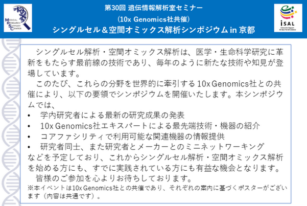 【遺伝情報解析室】第30回遺伝情報解析室セミナー「シングルセル&空間オミックス解析シンポジウム in 京都」開催のお知らせ
