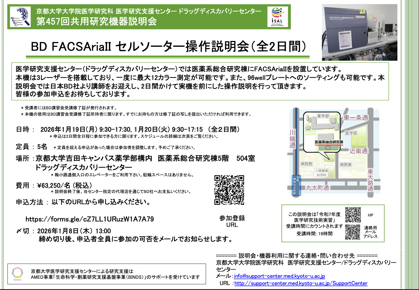 【ドラッグディスカバリーセンター】第457回共用研究機器説明会を開催します(BD FACSAriaII セルソーター操作説明会 : 1月19日〜20日 全2日間、日本語)